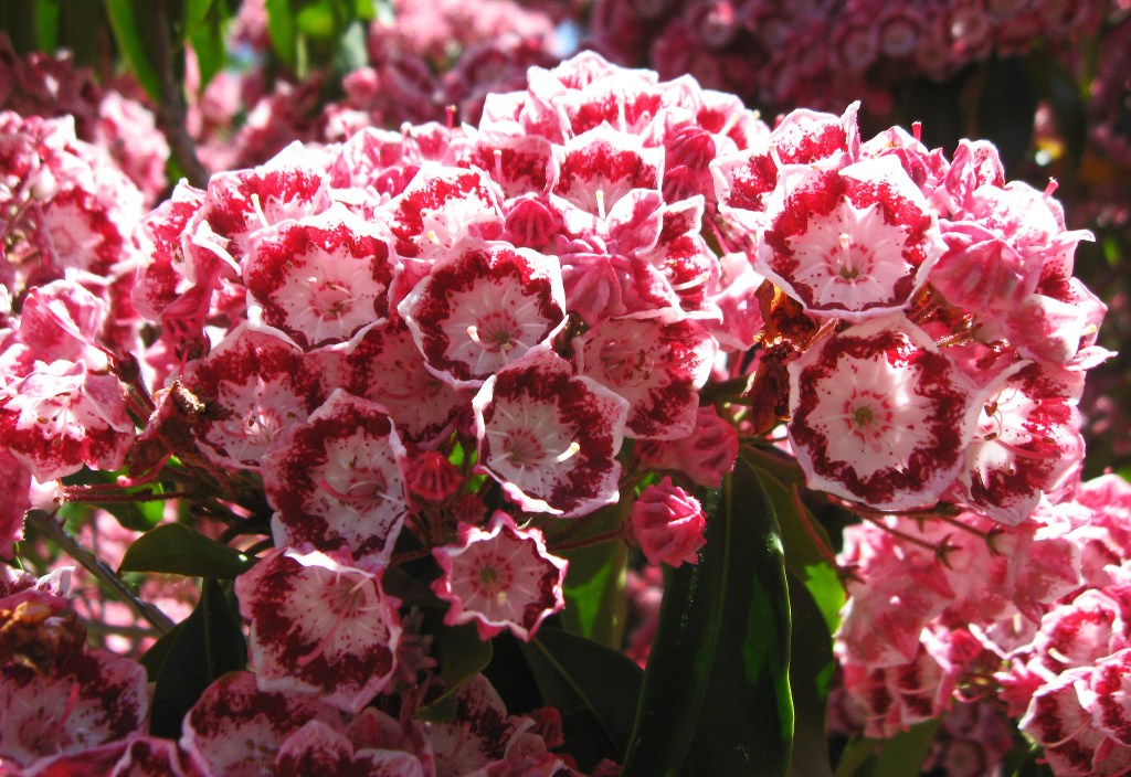 Mountain laurel has tough, glossy, deep green leaves resembling rhododendron leaves, with bowl-shaped flowers that look pentagonal or hexagonal when you look at them straight-on. The flower also has a unique pollen dispersal method (possibly only interesting to botany nerds) where it uses a spring-loaded stamen like a catapult when a bee or other pollinator lands on it, flinging pollen far beyond the petals.